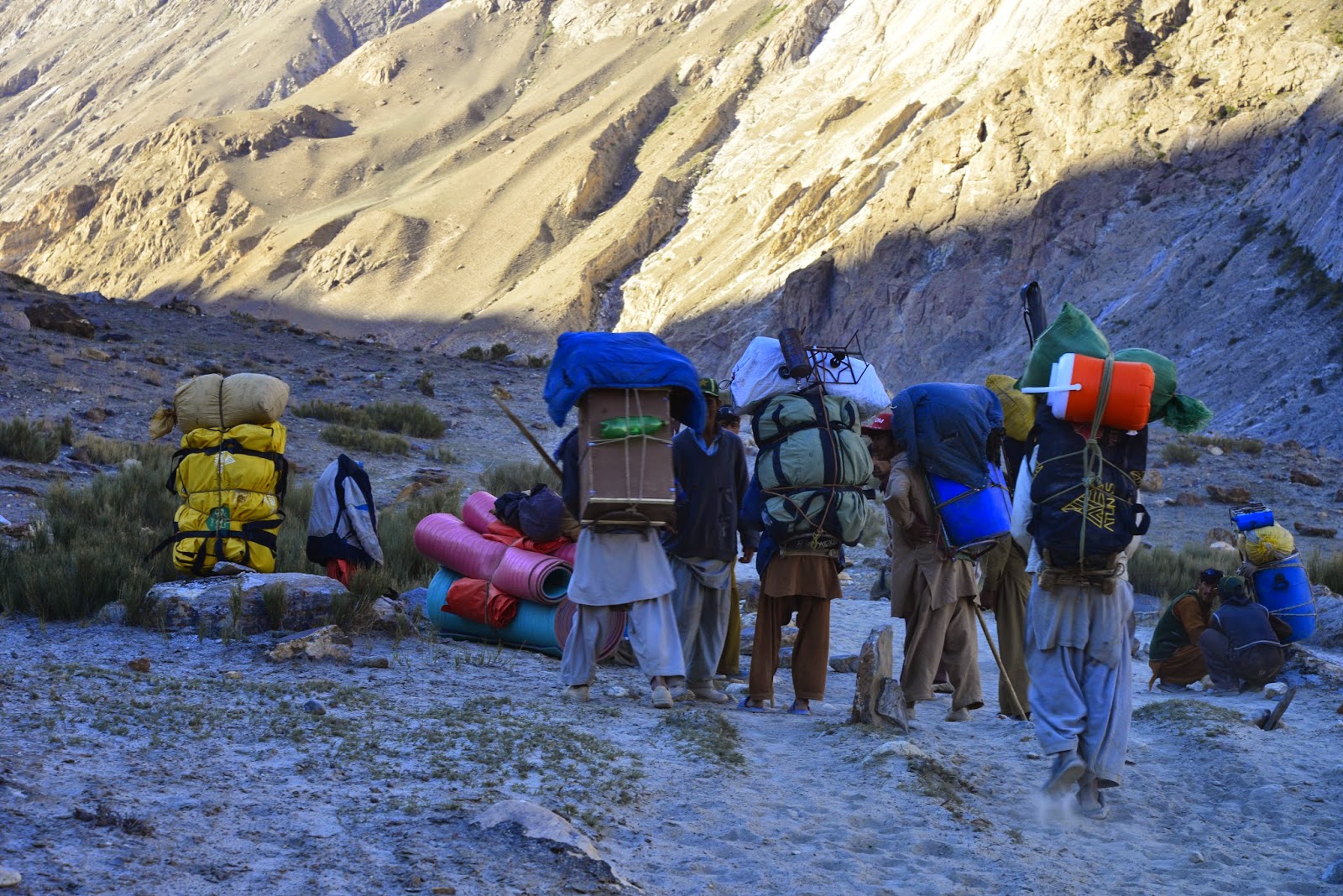 跋涉了四十餘公里路,今天休息一天,這個營地也在河階台地上,植栽茂盛,綠蔭蔽天,水源又豐富,正是休息的好營地。上午挑夫頭分發給所有挑夫各種食物,大家井然有序的圍在開闊地領取,這時才有機會仔細端詳巴基斯坦男人的臉龐特質,挺直的鼻樑,濃眉黑髮,個個是名星相,只是沒被星探發現。